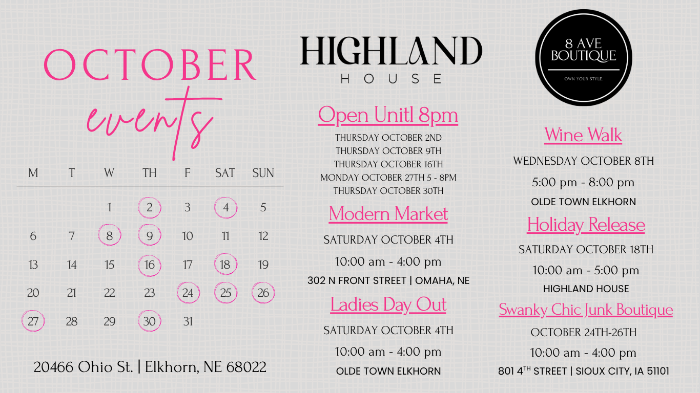 YOU CAN NOW SHOP WITH US IN STORE! At Highland House located in downtown Elkhorn 20466 Ohio Street Elkhorn, NE 68002