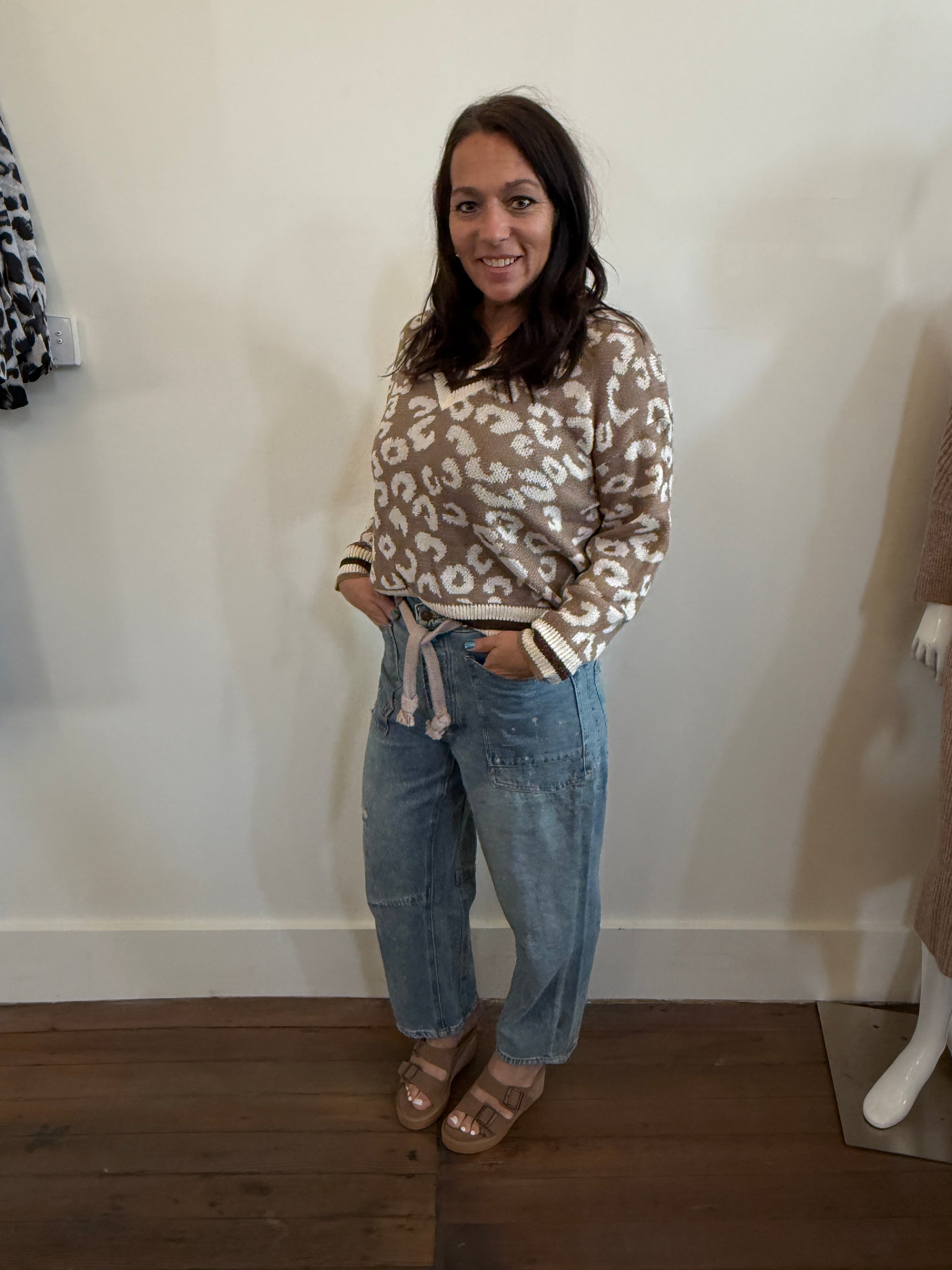 These relaxed-fit jeans feature a subtle light paint-splatter design and a cinched waist for a flattering, structured silhouette. Perfect for pairing with a crisp tee or elevated blouse for that off-duty, yet polished look.
